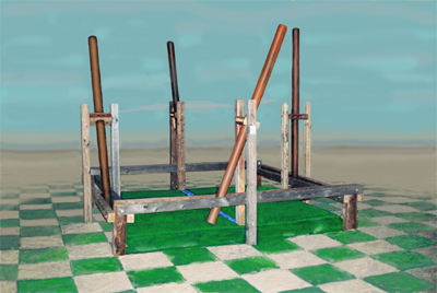 Installation aus Holz, Sand, Kunstrasen, Plastikröhren, Erbsen, Neonröhren, Blechdosen.